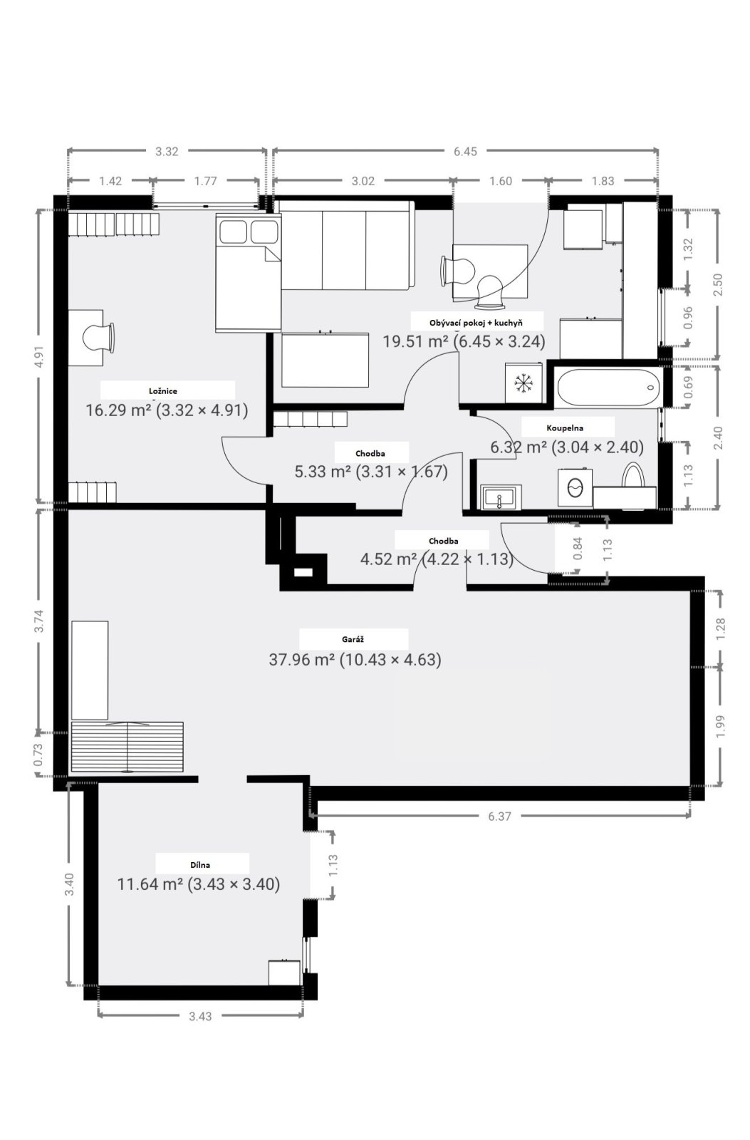 dále zahrnuje garáž, částečně podsklepený prostor a stodolu. Do