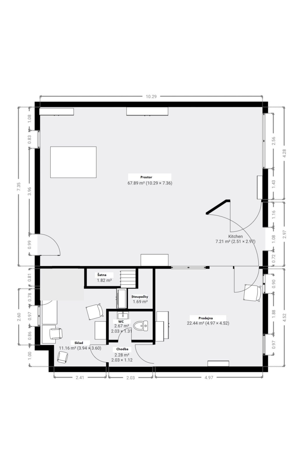 díky velkým výlohám na ulici. Celková plocha cca 108 m2, prostory se
