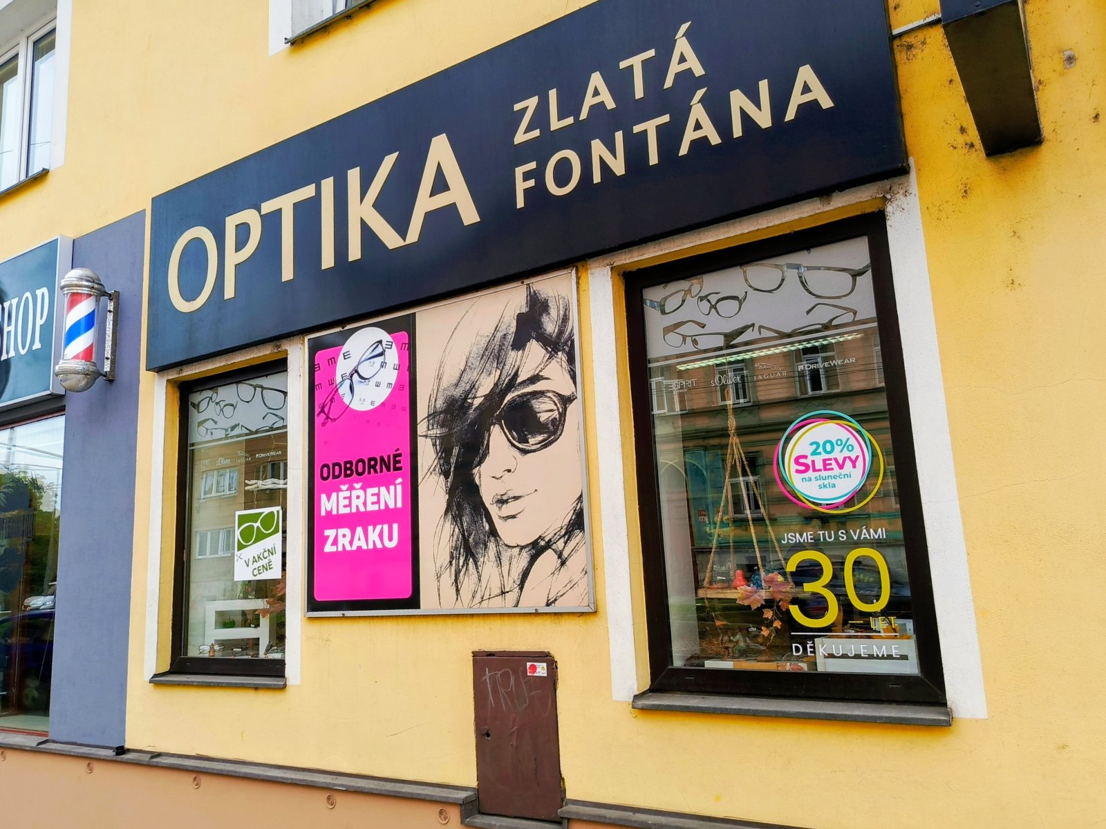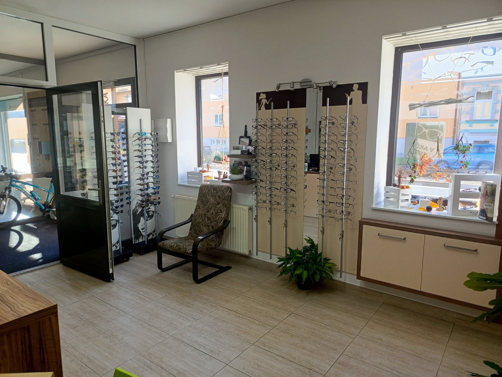 skleněnou stěnou na 2 provozovny – Optika (40 m2) a kanceláře firmy